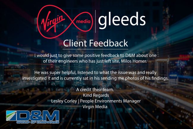 At D&M Group we do our best to make sure all our clients are 100% satisfied with the service they receive. Hi team   I would just to give some positive feedback to D&M about one of their engineers who have just left site, Milos Homer.   He was super helpful, listened to what the…