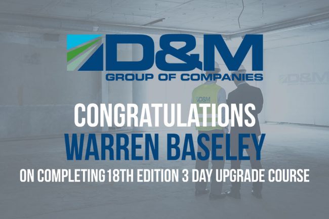 Warren Baseley has become the first of D&Ms electrical department to complete their 18th Edition 3 day upgrade course bringing his knowledge up to date with the latest industry best practice. D&M always strive to be at the forefront of industry requirements and best practice and this ensures compliance for ourselves and our clients. Congratulations…